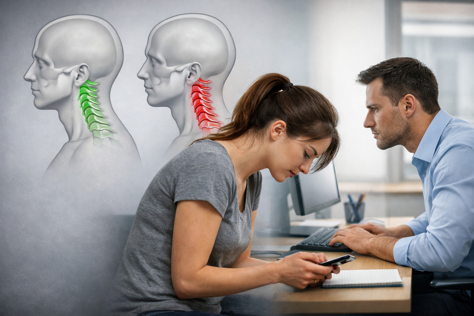 そんな生活が続くと、一時的に首が前に出た姿勢になりやすいと言われています。長時間のデスクワークやスマホ操作が重なることで、首や肩まわりの筋肉が疲労し、セルフチェックで当てはまりやすくなることがあるようです。