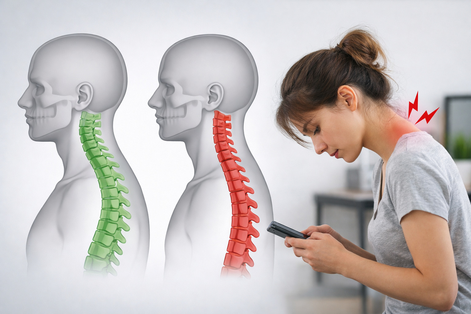 こうした質問もよく聞かれます。一般的には、長時間スマホやPCを操作することで、頭が前に出た姿勢になりやすく、その結果としてストレートネックに近い状態になることがあると言われています。