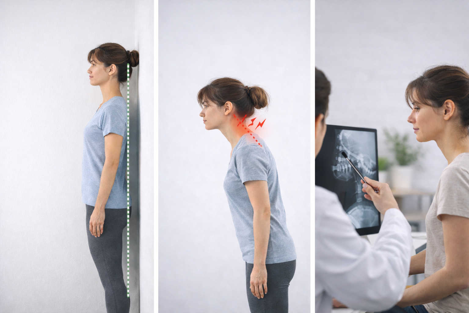 よく挙げられるのは、後頭部が自然につかない、立つと頭が前に出やすい、首を動かしたときに可動域が狭く感じるといった点です。