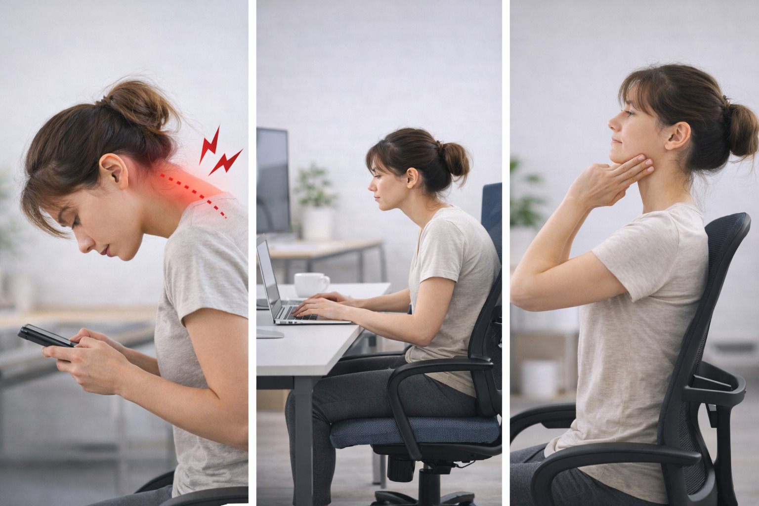 そんな場合、無理のない範囲でセルフケアを取り入れる人もいるようです。よく紹介されているのが、顎を軽く引いて首の後ろを伸ばす“あご引き”や、胸・肩まわりを開くストレッチです。