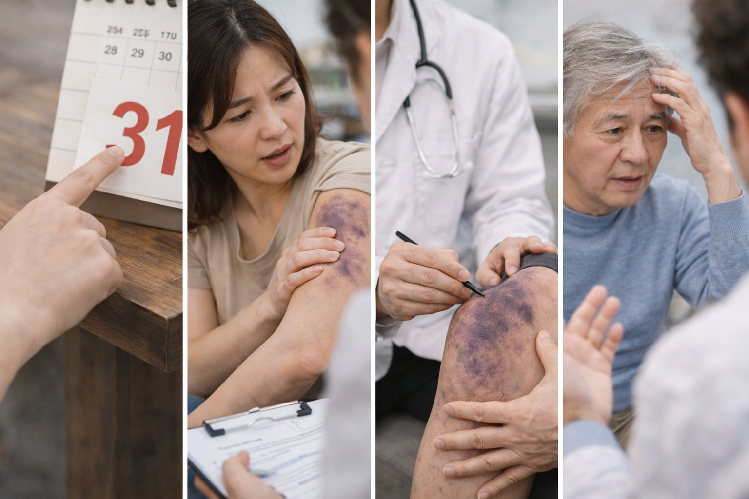 「何を聞かれるんだろう…」と不安になりますよね。一般的には、いつ頃から内出血があるのか、きっかけはあったか、痛みの有無や変化などを確認されることが多いと言われています。