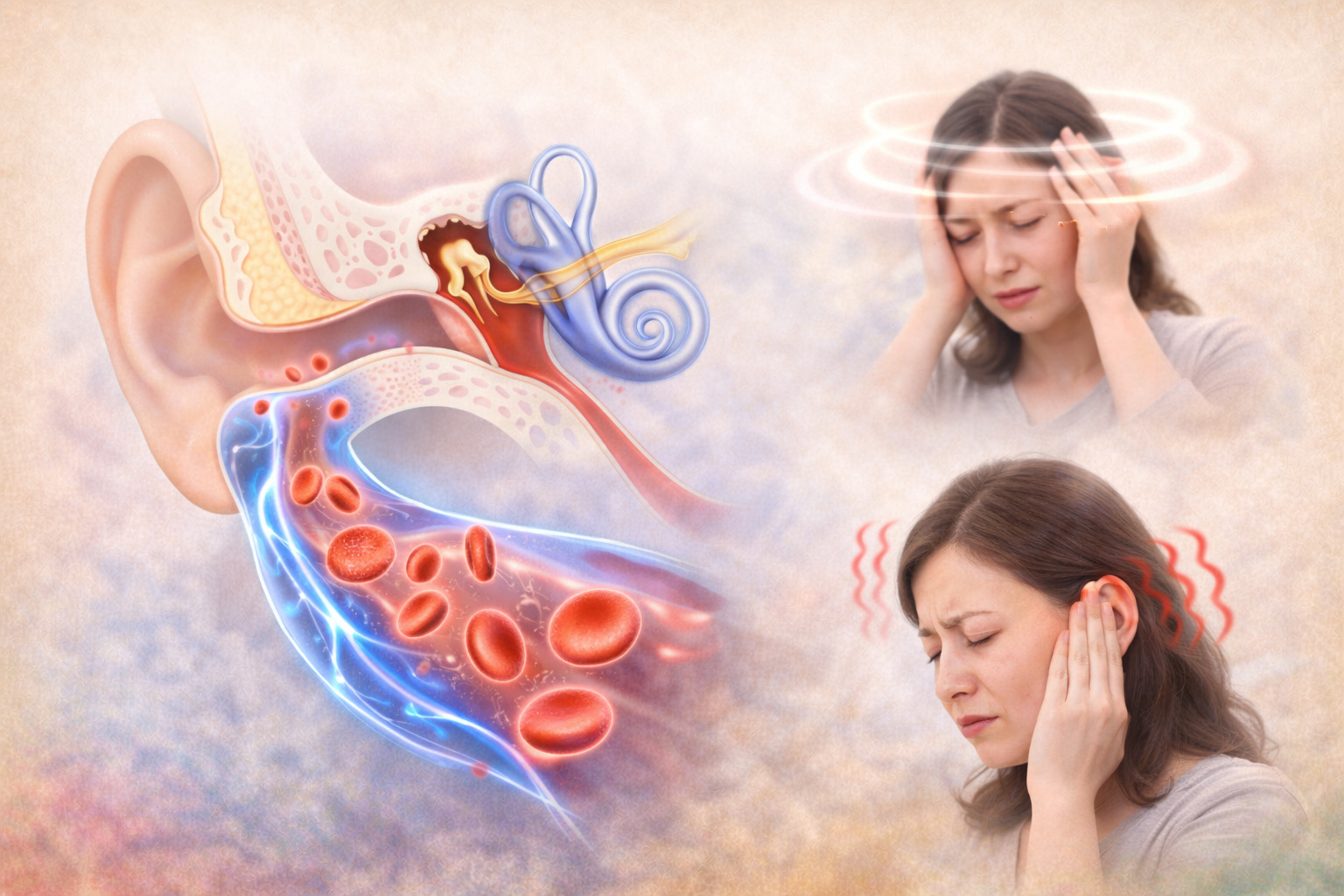 「最近、ふわっとする感じがあるけど関係ある?」めまいや耳鳴り、ふらつきは、内耳の働きがうまくいっていないときに現れやすい症状だと言われています。血流が十分に行き届かない状態が続くと、情報伝達が乱れ、違和感として感じやすくなる場合があるようです。