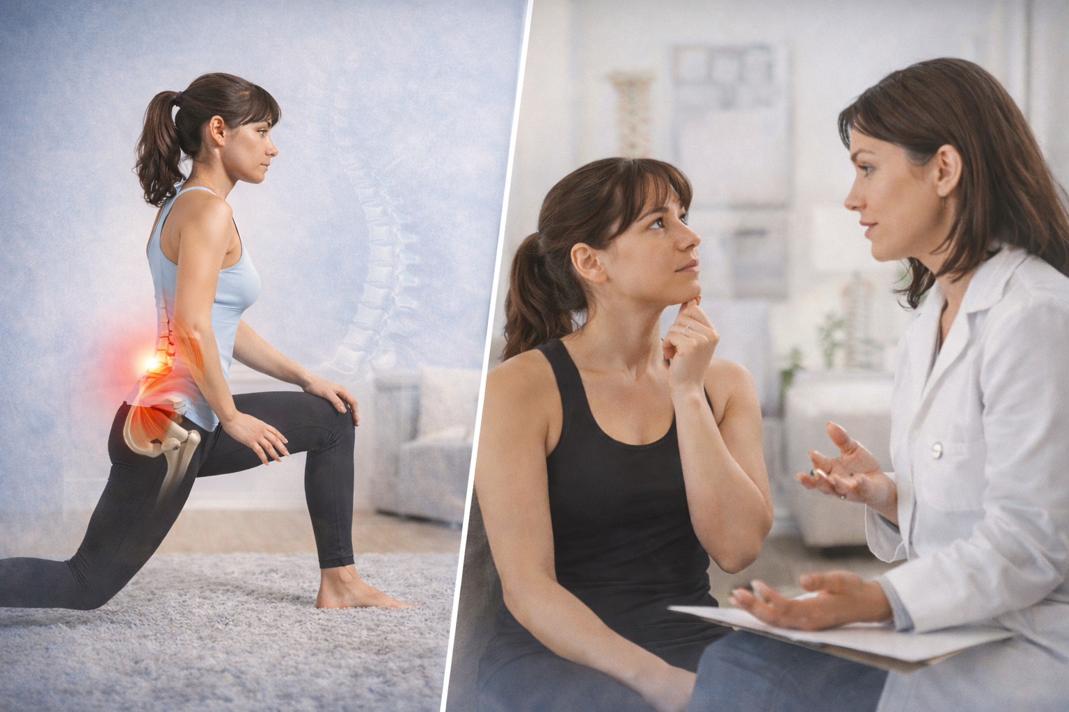 片膝立ちで前に体重を乗せるランジ姿勢は、股関節前面をゆるやかに伸ばしやすいとされています。腰を反らしすぎず、骨盤を立てる意識で行うと、腸腰筋に刺激が入りやすいと言われています。