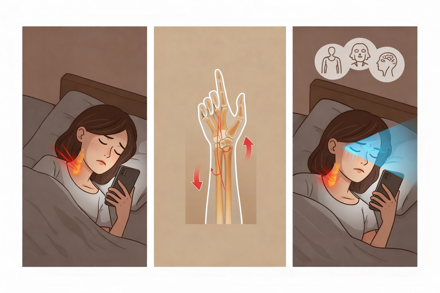 このような症状が重なりやすいのも、寝ながらスマホの特徴と言われています。首・肩・目は互いに影響し合いやすいため、一か所の負担が連鎖的に広がるケースがあるようです。その結果、朝起きたときに「なんとなくスッキリしない」と感じやすくなるとも言われています。