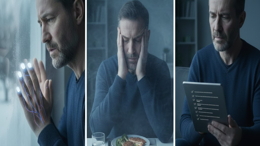 男性の場合、仕事のプレッシャーや長時間労働によるストレスが、自律神経のバランスに影響すると言われています。自律神経が乱れると、血管の収縮・拡張がうまく切り替わらず、手先の血流が後回しになりやすいと考えられています。