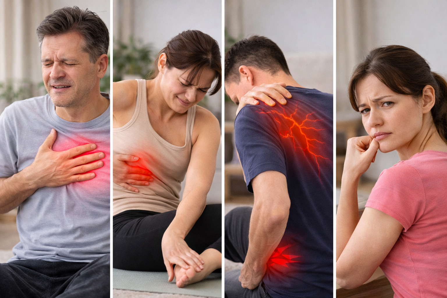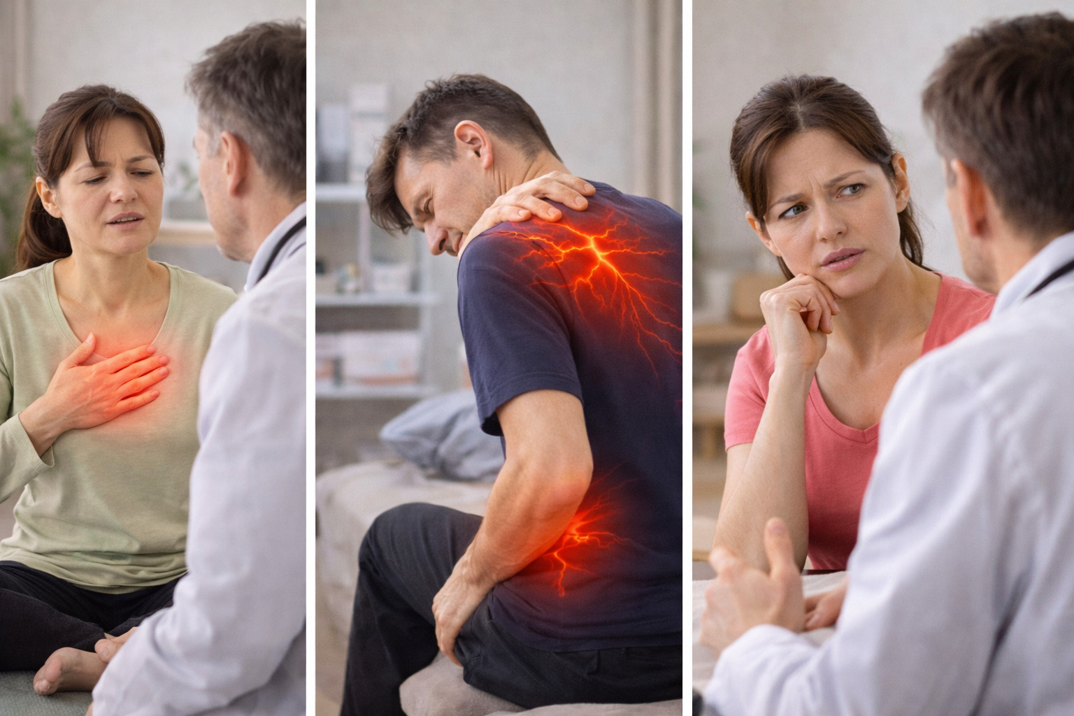 「胸が痛い=心臓?」と不安になるのは自然なことですよね。肋間神経痛は胸の前側や背中にも痛みが出るため、心臓や肺、胃などの内臓の不調と区別しづらいと言われています。特に初めて経験する場合、「重大な病気では?」と強い不安につながるケースもあるようです。