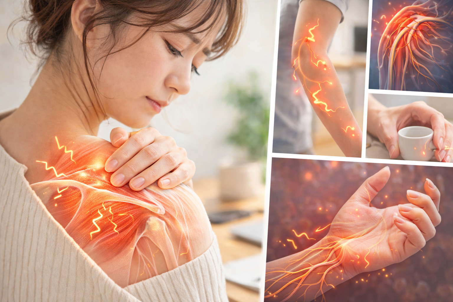 このような症状がある場合、神経に関連するトラブルの可能性が指摘されることもあると言われています。肩周りには多くの神経が通っているため、筋肉の緊張や姿勢の影響で神経が圧迫されることがあるそうです。