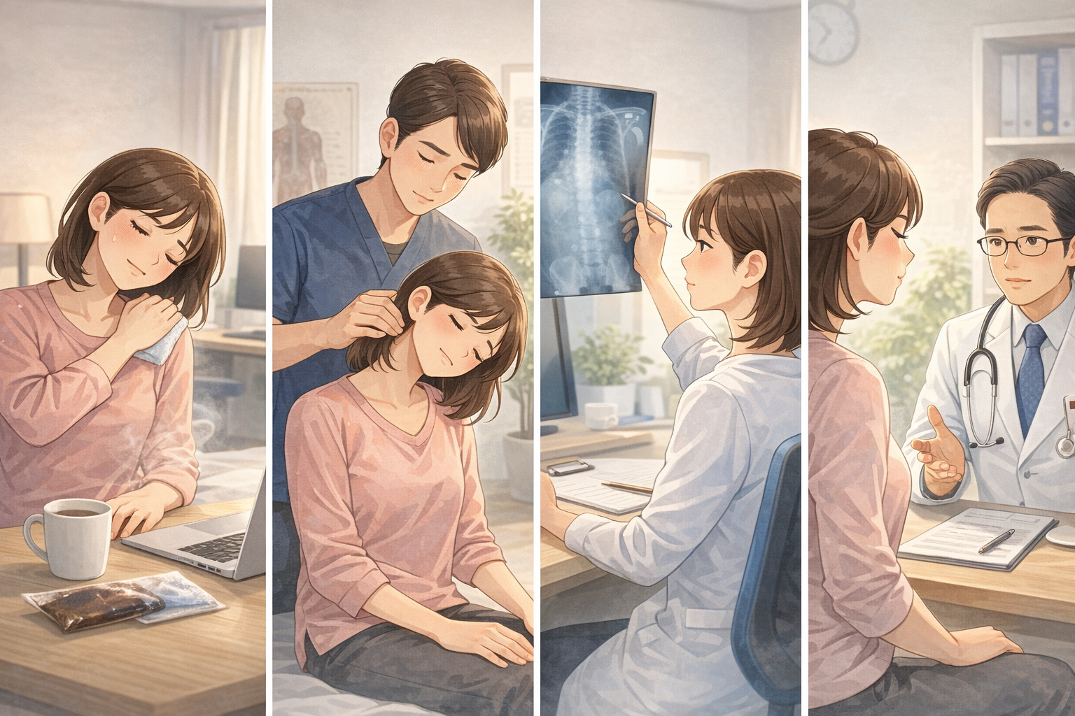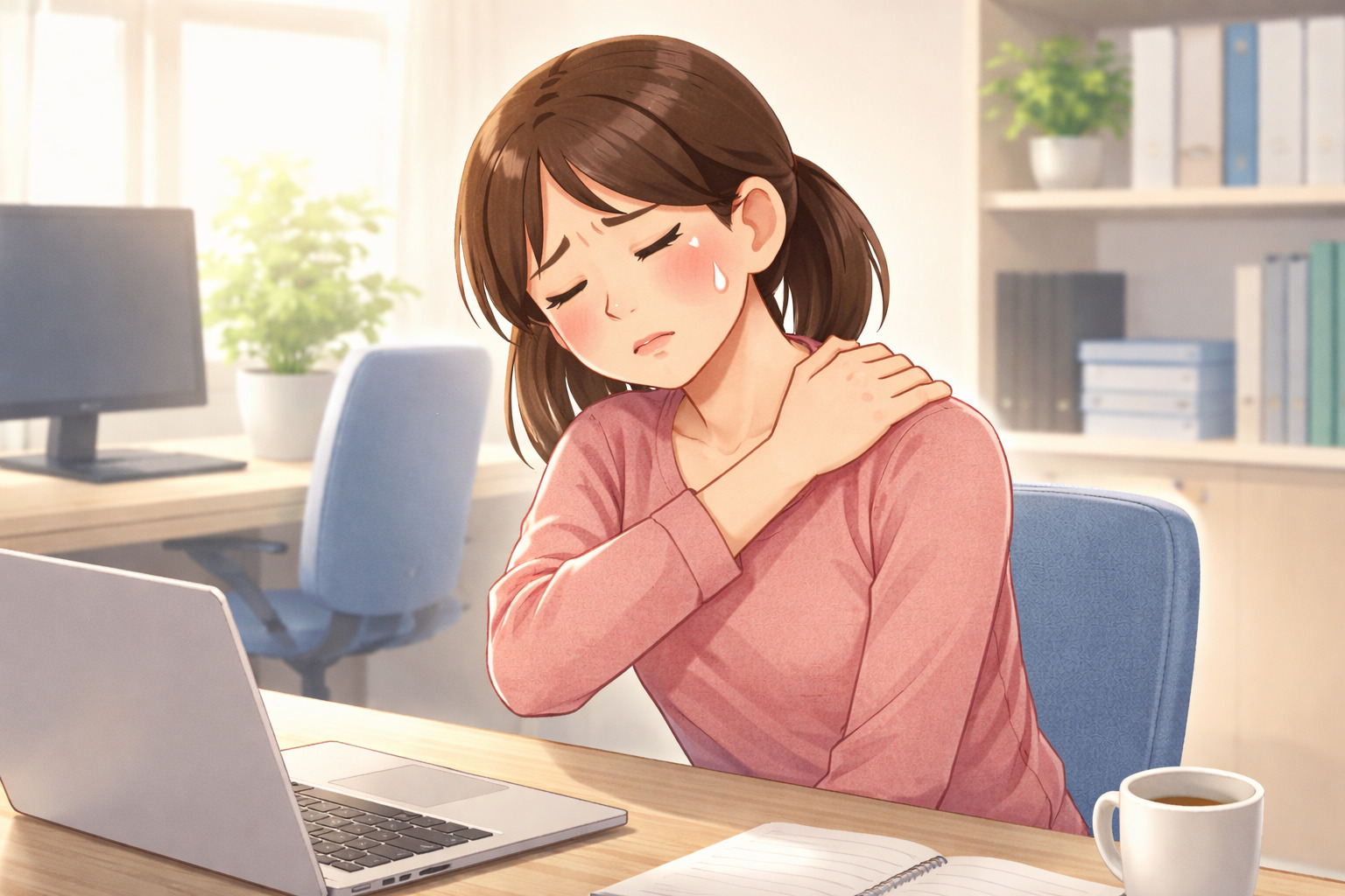 肩こりは筋肉の緊張によって血流が低下し、周囲の神経が刺激されることで不快感につながる場合があると言われています。まずは長時間同じ姿勢を避け、軽いストレッチや休憩を取り入れることが大切とされています。