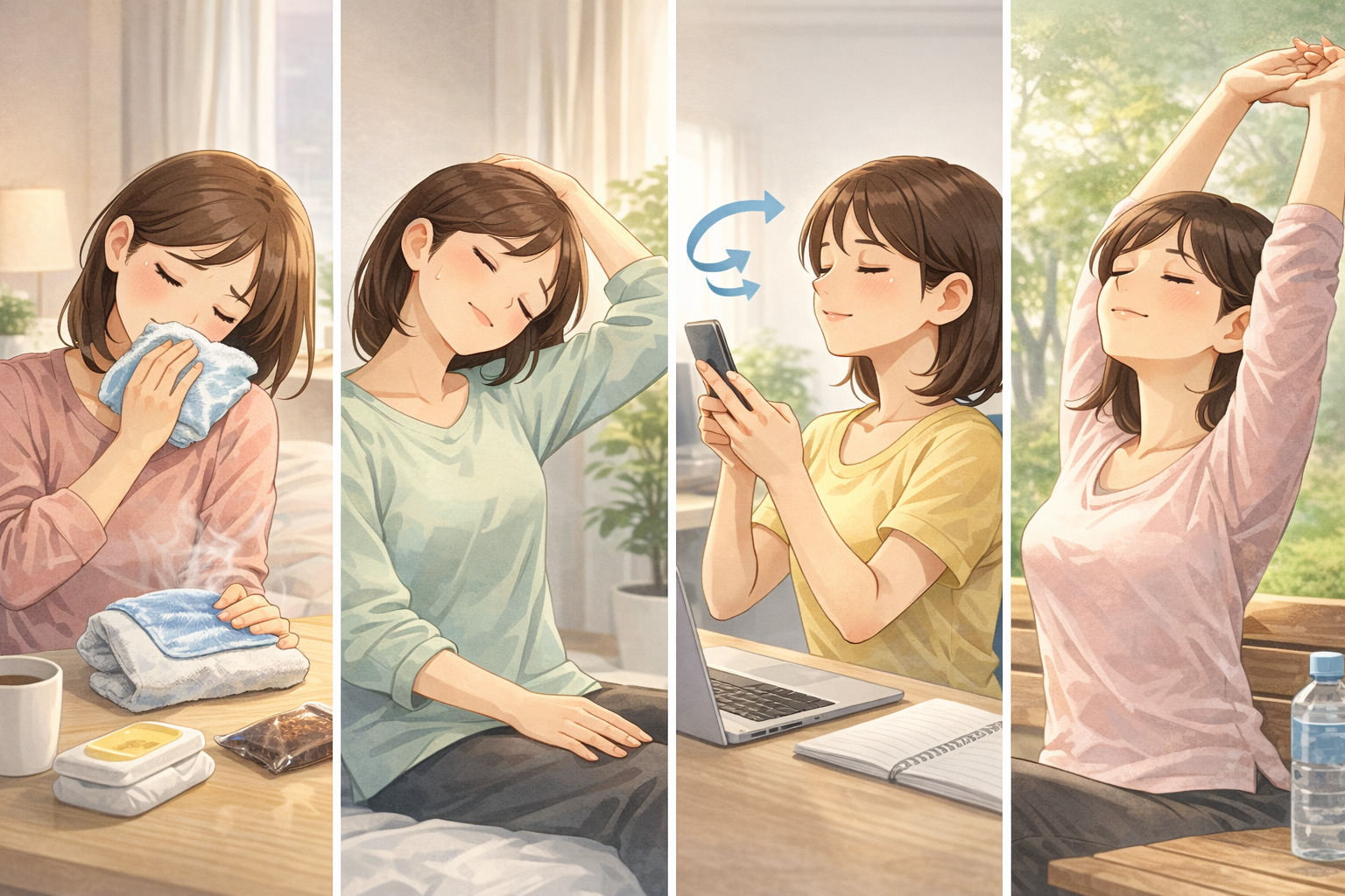 首の側面をゆっくり伸ばしたり、肩甲骨を軽く動かしたりするだけでも、筋肉の緊張がやわらぎやすいと言われています。反動をつけず、呼吸を止めないことが大切だそうです。