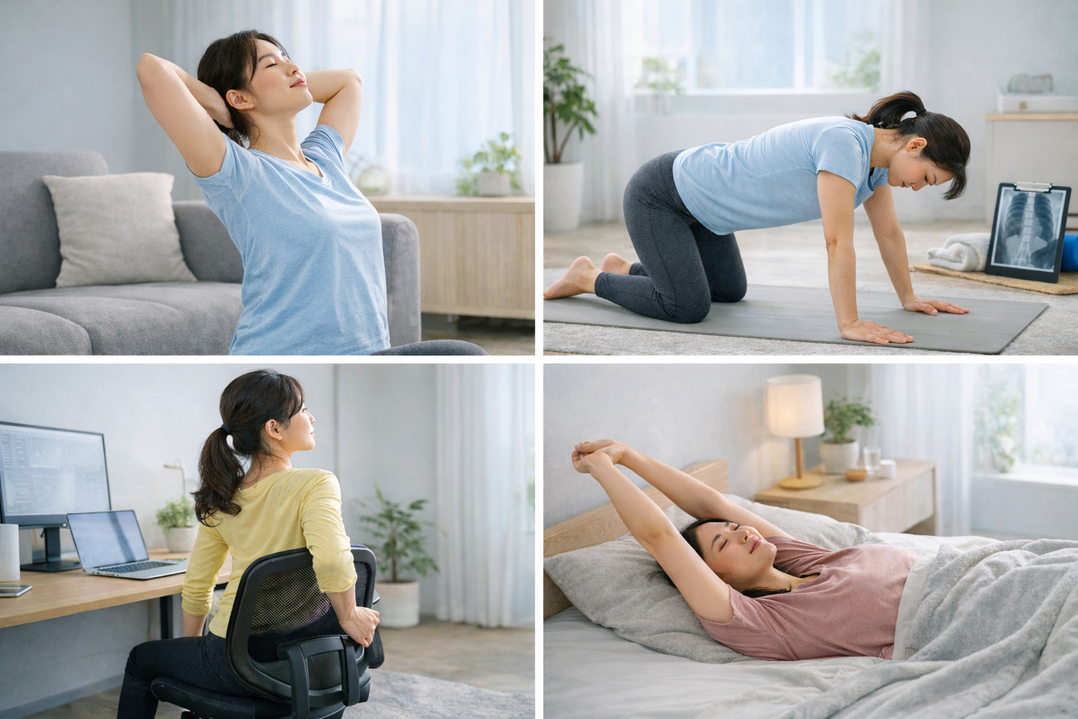 実は、痛む場所によって体の使い方や負担のかかり方が違うため、合う動きも変わると言われています。同じ背中の痛みでも原因は一つではなく、姿勢や生活習慣が関係しているケースが多いようです。ここでは症状別に、無理なく取り入れやすい方法を紹介します。
