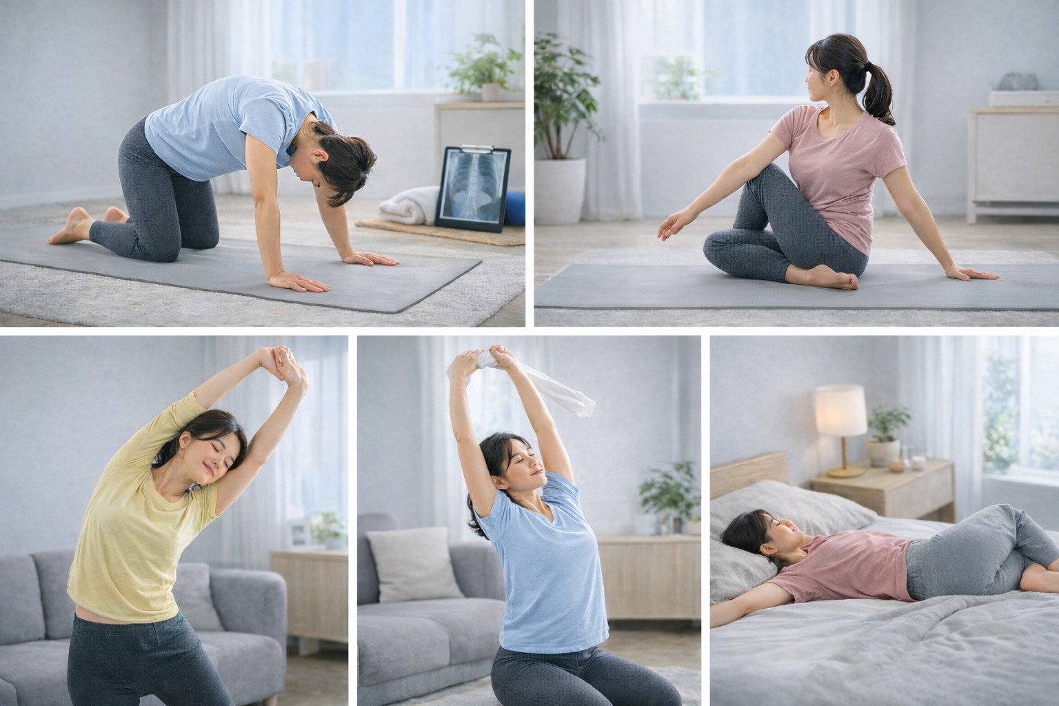 「じゃあ、どんな方法なら安心?」と思いますよね。基本は呼吸を止めず、ゆっくり動かすこと。息を吐きながら背中を丸めたり、肩甲骨を寄せたりする動きが、筋肉をやさしくゆるめる助けになると言われています。