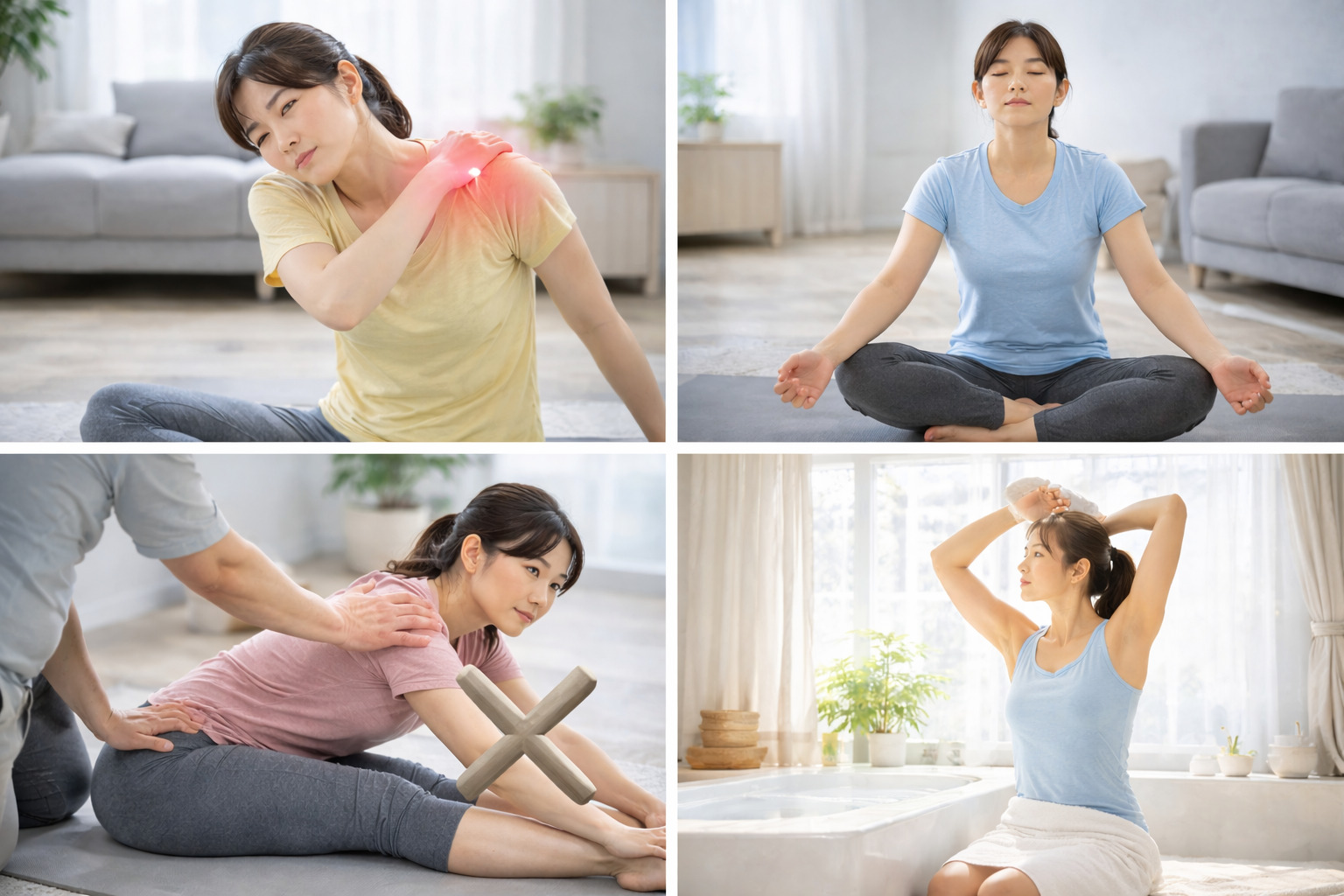 勢いをつけて動かしたり、左右差を無視して同じ強さで行うのは注意が必要と言われています。「昨日できたから今日も同じ」と考えるより、その日の体調に合わせるほうが負担を減らしやすいようです。違和感が強い場合は無理をしないことも大切です。