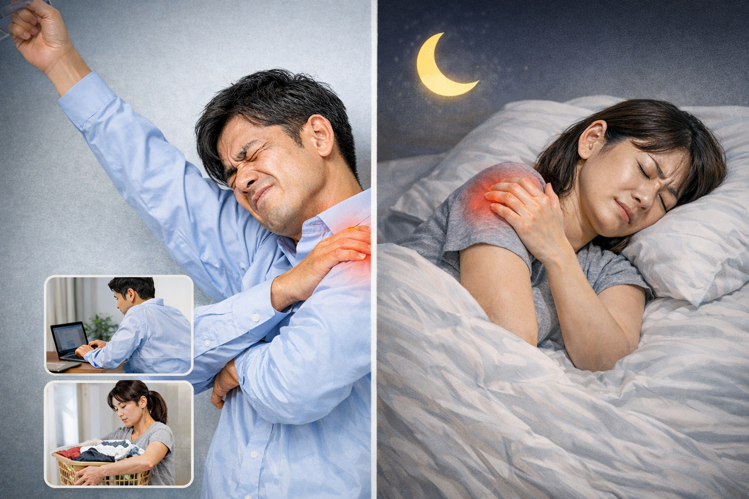 夜間痛や動かしづらさが続く場合、肩まわりの緊張や炎症が関係している可能性があると考えられているようです。