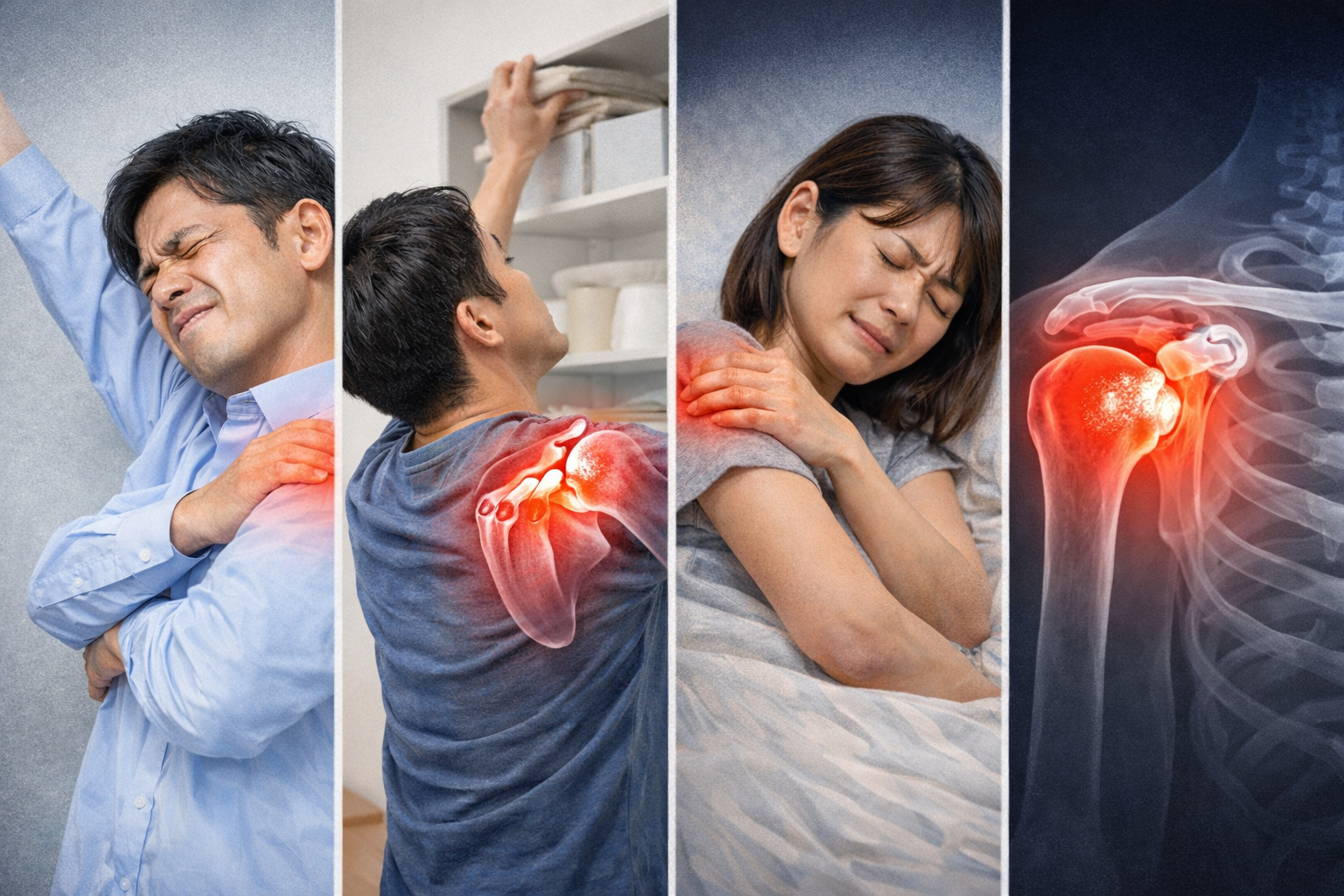 このような夜間痛があるかどうかも、ひとつの目安になると言われています。また、「以前より腕が高く上がらない」「背中に手を回しづらい」といった可動域制限を感じる方も少なくありません。