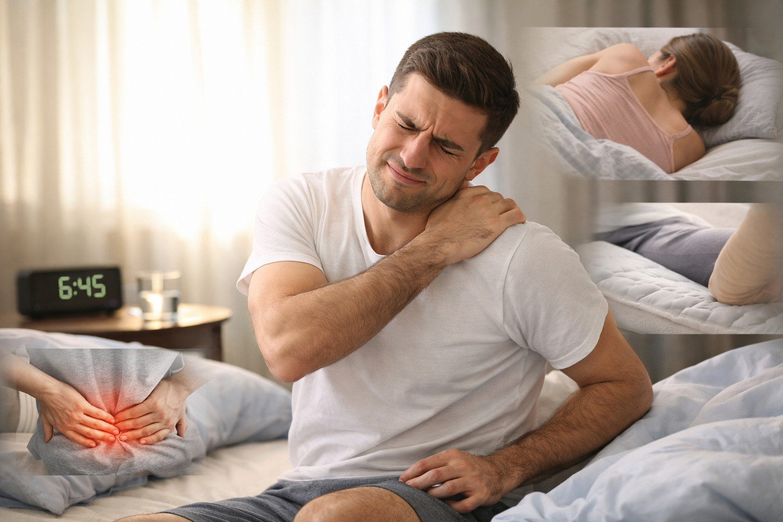 寝返りが少ないと、同じ筋肉に負担が集中しやすくなると言われています。また、枕やマットレスが体に合っていない場合、首・肩・腰など一部の筋肉が緊張し続け、朝の痛みにつながることもあるようです。
