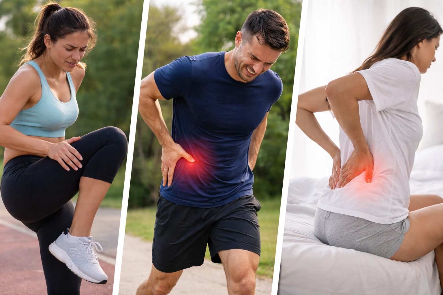股関節は体の中心にあり、歩く・走る・しゃがむなど、ほぼすべての動作に関わります。特に腸腰筋や中殿筋は、脚を持ち上げたり体を支えたりする役割があるため、運動量が急に増えると疲労がたまりやすくなります。「最近ランニングを始めた」「久しぶりにスクワットをした」というタイミングで痛みが出やすいのも、このためです。