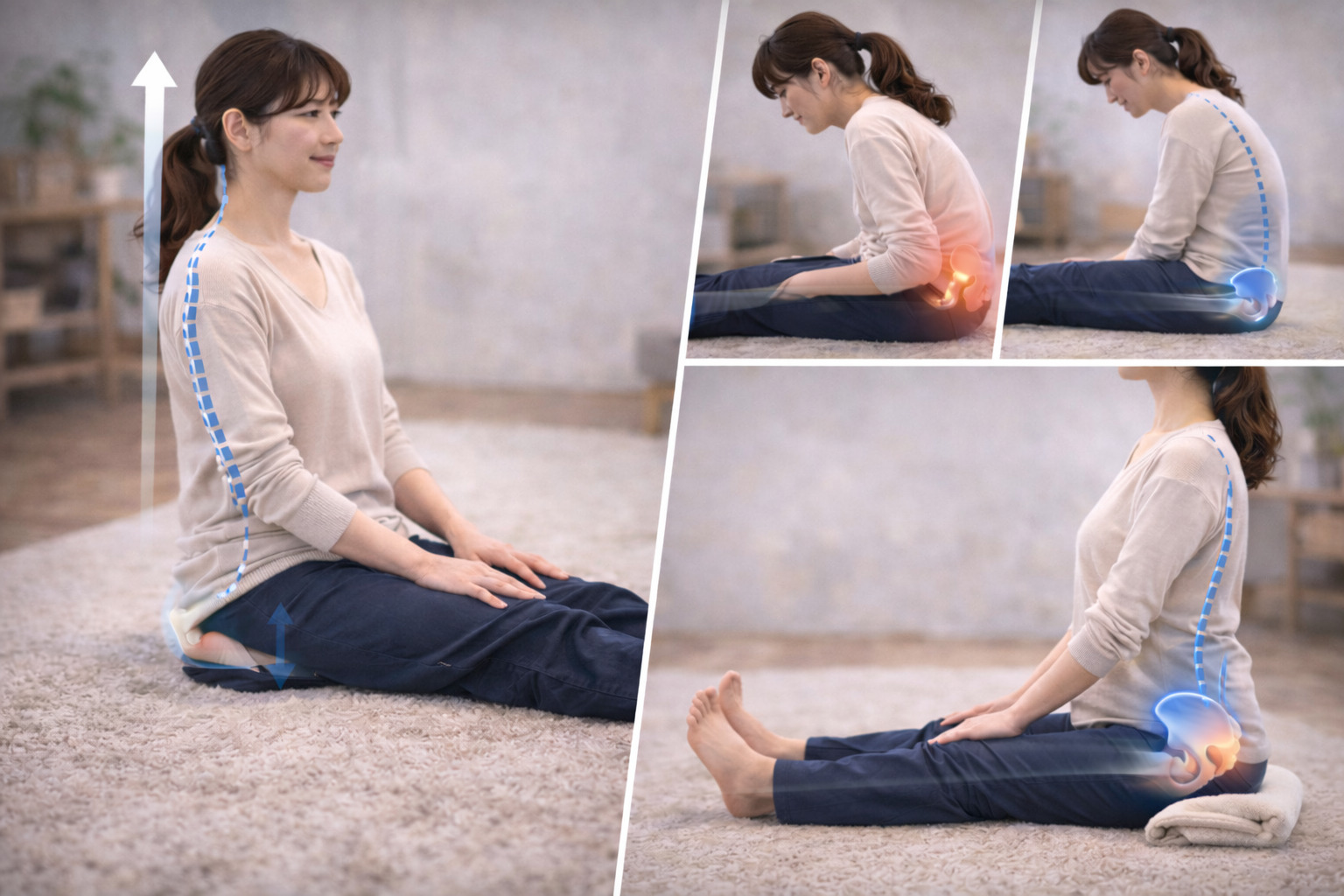 お尻の下に手を入れてみて、左右の坐骨が床に均等に当たっているかを感じてみましょう。そこから頭が上に引っ張られるようなイメージで背骨を伸ばすと、無理なく姿勢を作りやすくなるようです。力を入れすぎず、「楽に座れる位置」を探すことがポイントと考えられています。