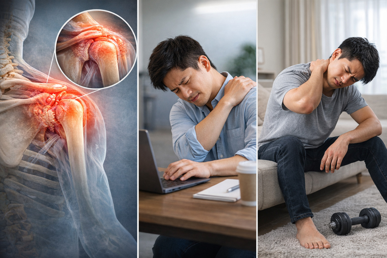 一般的には、肩の痛みや動かしづらさを伴う状態をまとめて肩関節周囲炎(いわゆる frozen shoulder)と呼ぶそうです。つまり「30肩」「四十肩」「五十肩」は、年齢によって呼び方が変わっているだけで、本質的な体の変化は同じと考えられているようです。名前だけを見ると別の症状のように感じますが、「肩まわりに炎症や動きの制限が起きている状態」という点では共通していると説明されています。