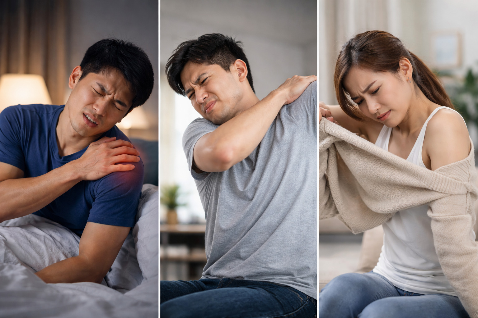 30肩の初期は、肩関節の内部で炎症が起きている時期と考えられており、特に腕を上げたり後ろへ回したりした瞬間に鋭い痛みを感じやすいそうです。特徴的なのが夜間痛です。「寝ていると痛くて目が覚める」「寝返りのたびに肩が気になる」といった声も多く、安静にしていても違和感が出ることがあると紹介されています。