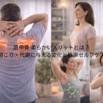 また、温めるケアも血流をサポートする方法の一つとして紹介されています。入浴や温タオルなどを活用し、リラックスした状態で行うのがポイントとも言われています。さらに姿勢改善も重要で、猫背を避けるだけでも肩への負担が変わる可能性があるそうです。